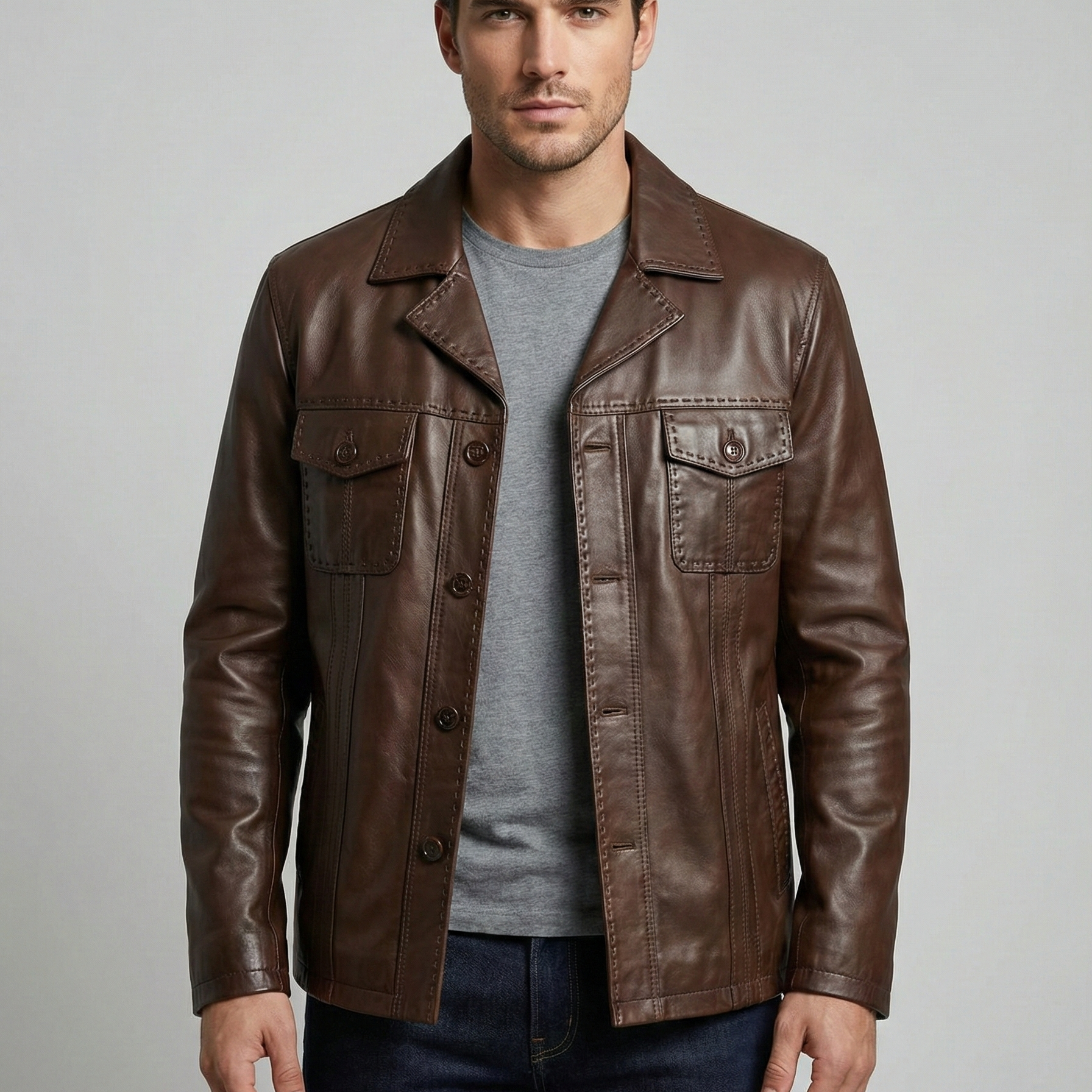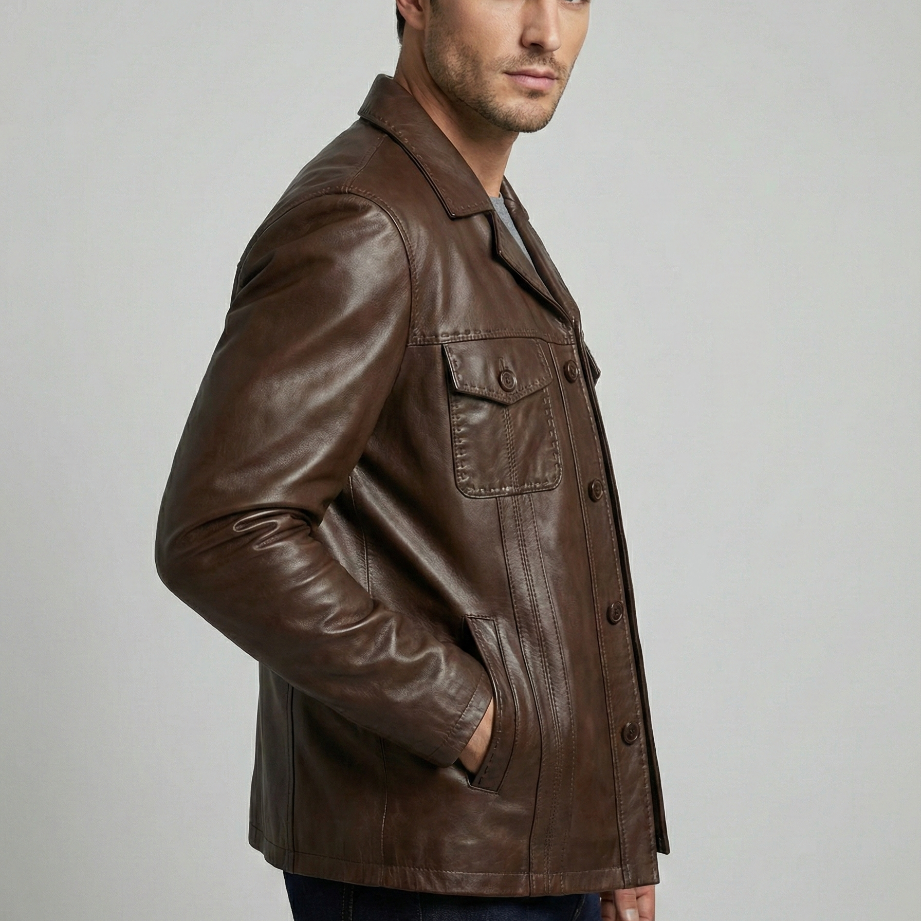 Klasik giyimin en modern ve zamansız yorumu olan 2114 Fındık Erkek Deri Ceket, İtalyan kesimin o eşsiz zarafetini ve asaletini gardırobunuza taşıyor. Fındık renginin doğal ve sofistike tonları, karakteristik dört düğmeli şık ön kapama tasarımıyla mükemmel bir uyum yakalayarak güçlü ve seçkin bir duruş sergiliyor.