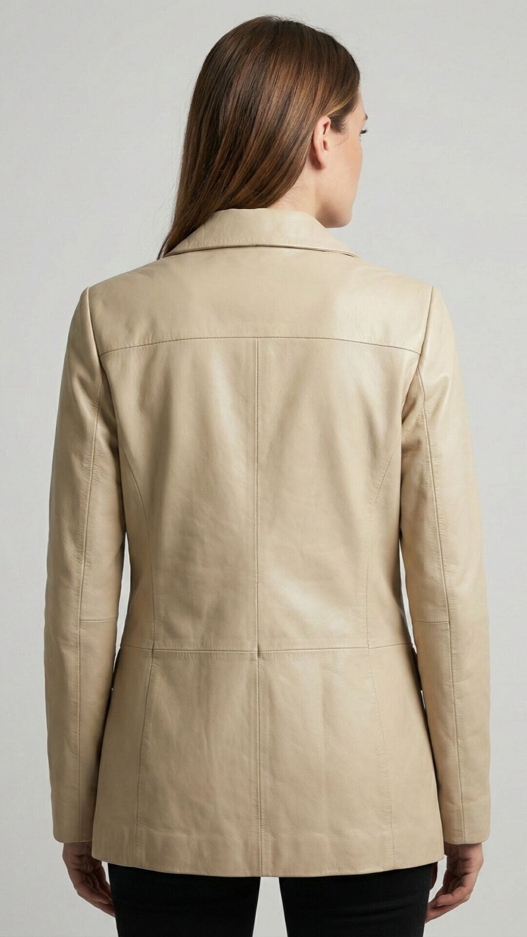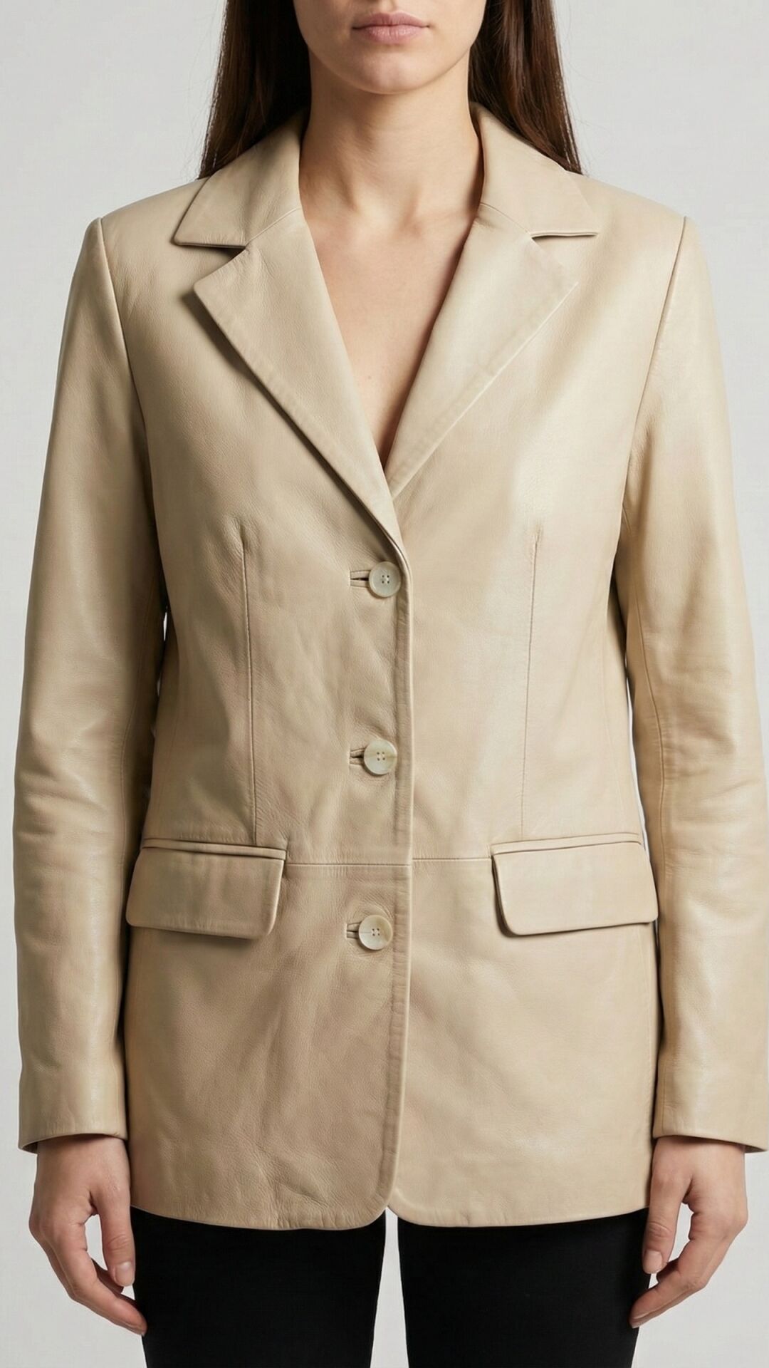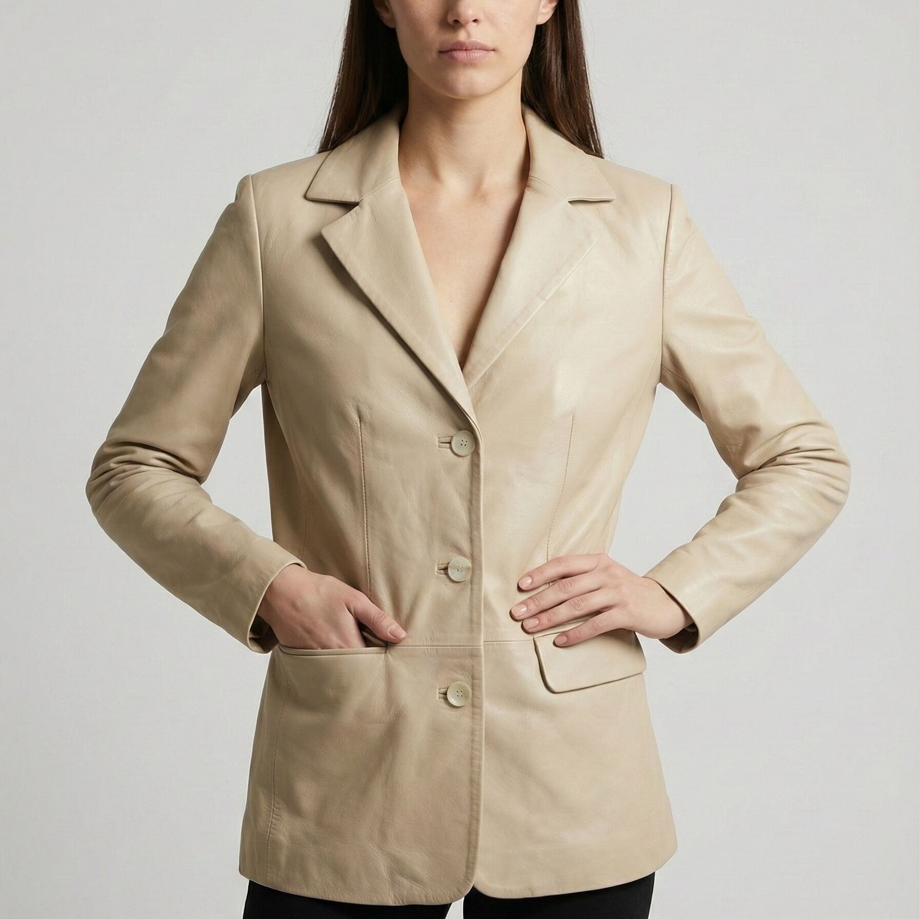 Zamansız Blazer Tasarımı: Klasik yaka kesimi ve üç düğmeli ön kapamasıyla Dalia Krem Bayan Deri Ceket, modası asla geçmeyecek bir silüet sunar.
