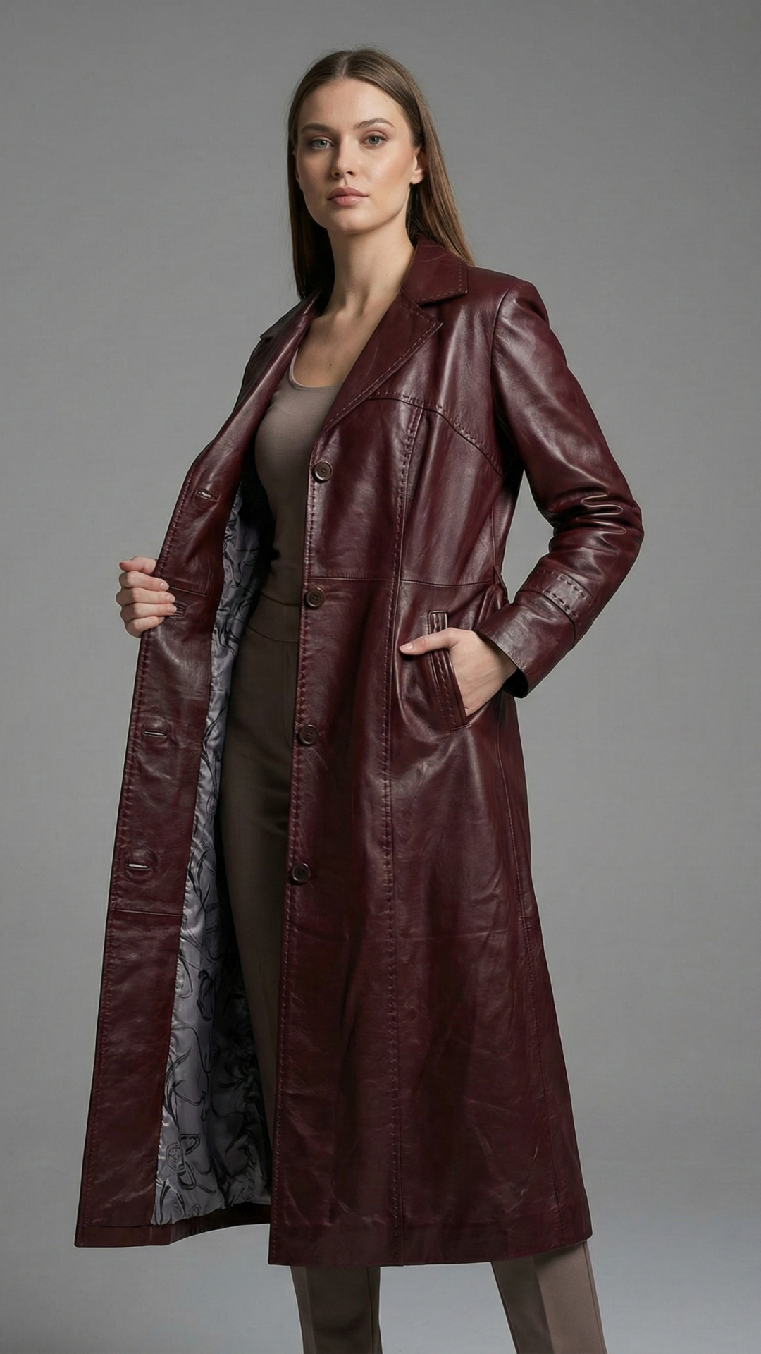 İçten Dışa Kalite: Hareket halindeyken parlayan özel desenli saten astarı, 120 cm'lik bu dev eserin kalitesini tamamlayan en şık detaydır. Belindeki kuşağıyla silüetinizi vurgulayan Gisella Bordo Bayan Deri Pardüse, Sezon Deri ustalığının en nadide parçalarından biridir.