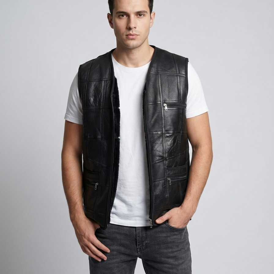 Bu model, tek parça kürk maliyetlerini düşürmek amacıyla, usta işçilikle bir araya getirilen parça kuzu kürklerinden imal edilmiştir. Dış yüzeyindeki napa deri parçalarının oluşturduğu geometrik dikiş detayları, ürüne modern bir "patchwork" karakteri kazandırırken, içinizi saran yoğun kürk dokusu soğuğa geçit vermez. Parçalı Napa Erkek Deri Yelek, hem spor hem de klasik kombinlerinizde "akıllı şıklığın" simgesi olacak.