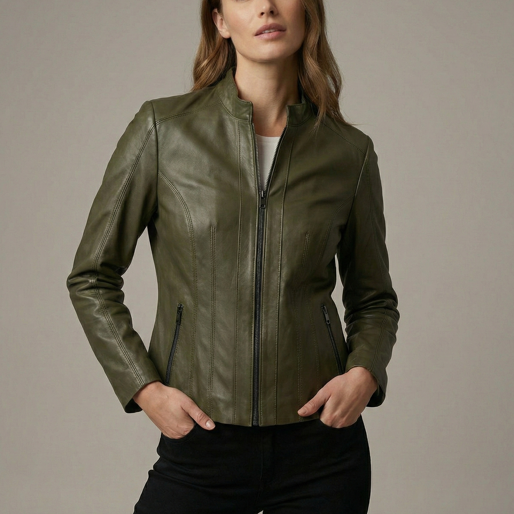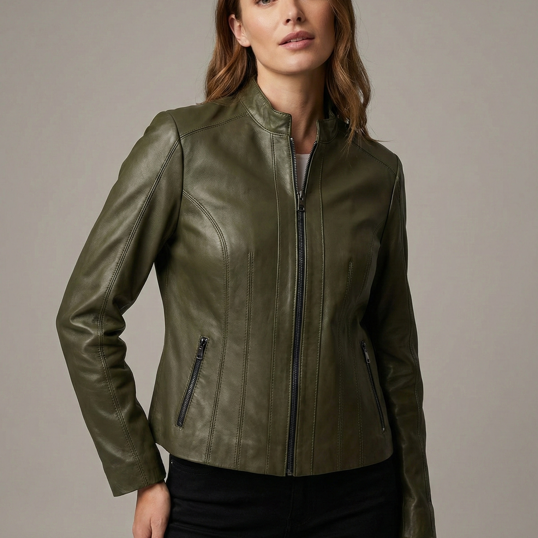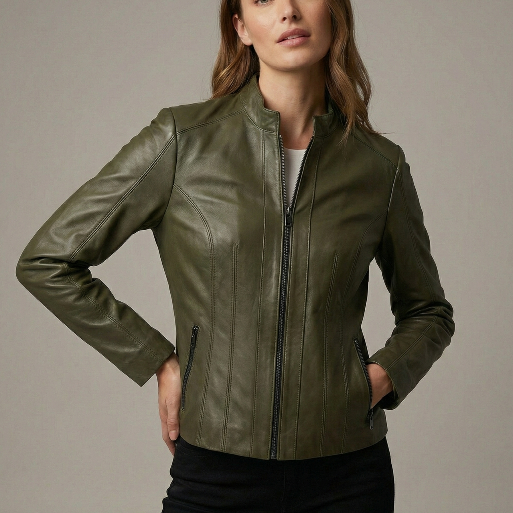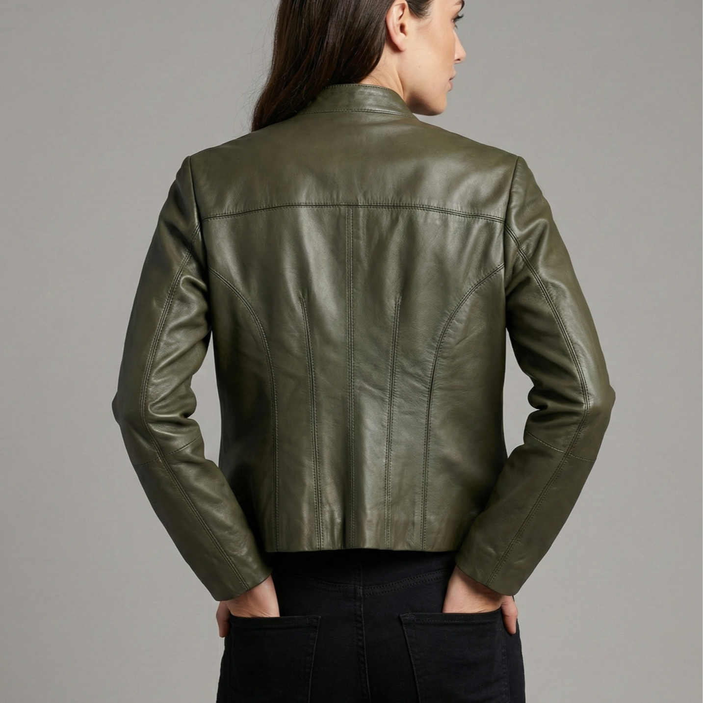 Bu tasarımın en çarpıcı özelliği, ustalıkla işlenmiş dikiş oyunlarıdır. Gövde boyunca uzanan özel dikey paneller ve dikiş detayları, Riva Yeşil Bayan Deri Mont modeline derinlik kazandırırken, görsel bir illüzyonla bel hattınızı daha ince ve formda gösterir. Zarif hakim yakası ve vücudu saran fit kalıbı, hem jeanlerle sportif hem de kumaş pantolonlarla ofis şıklığına uyum sağlar.