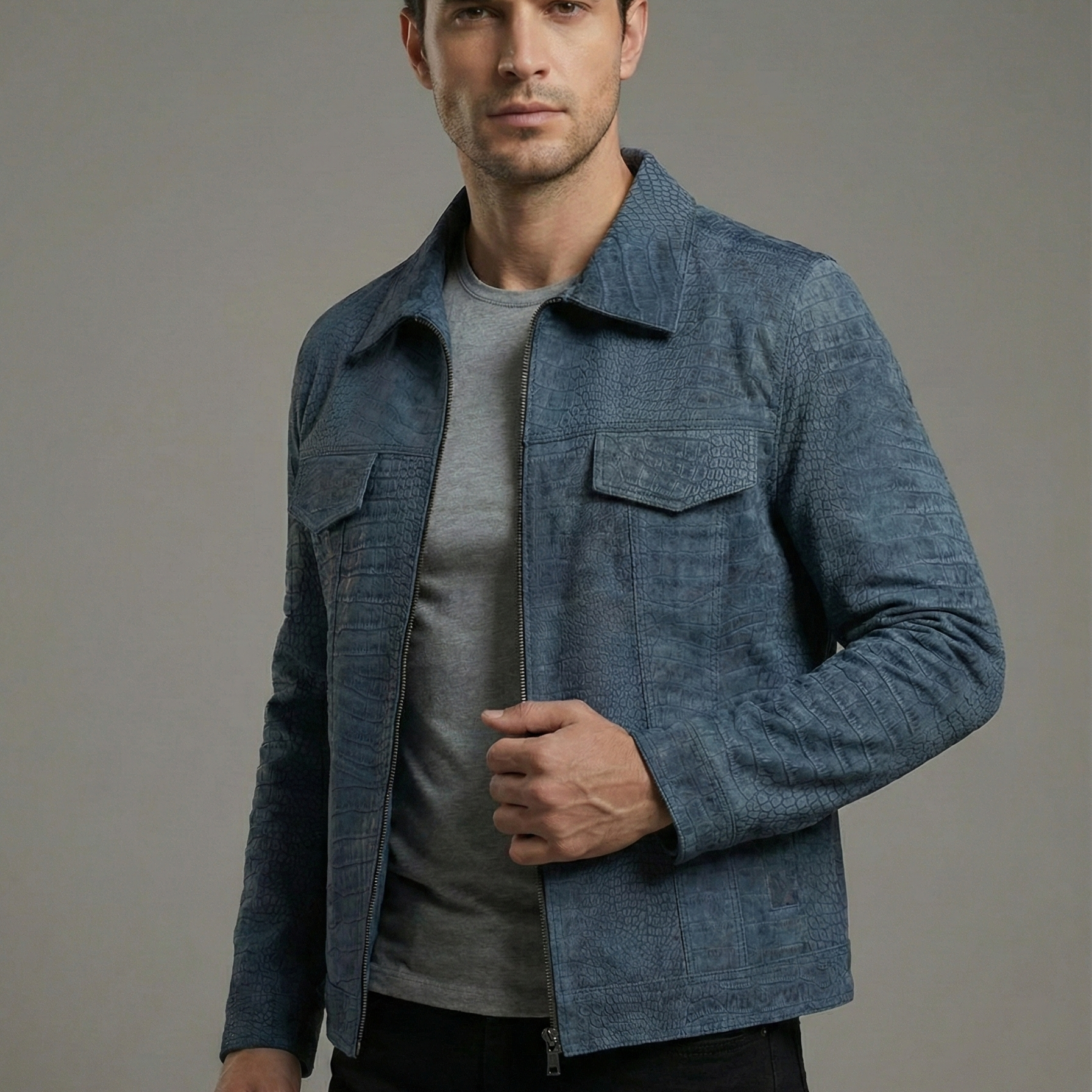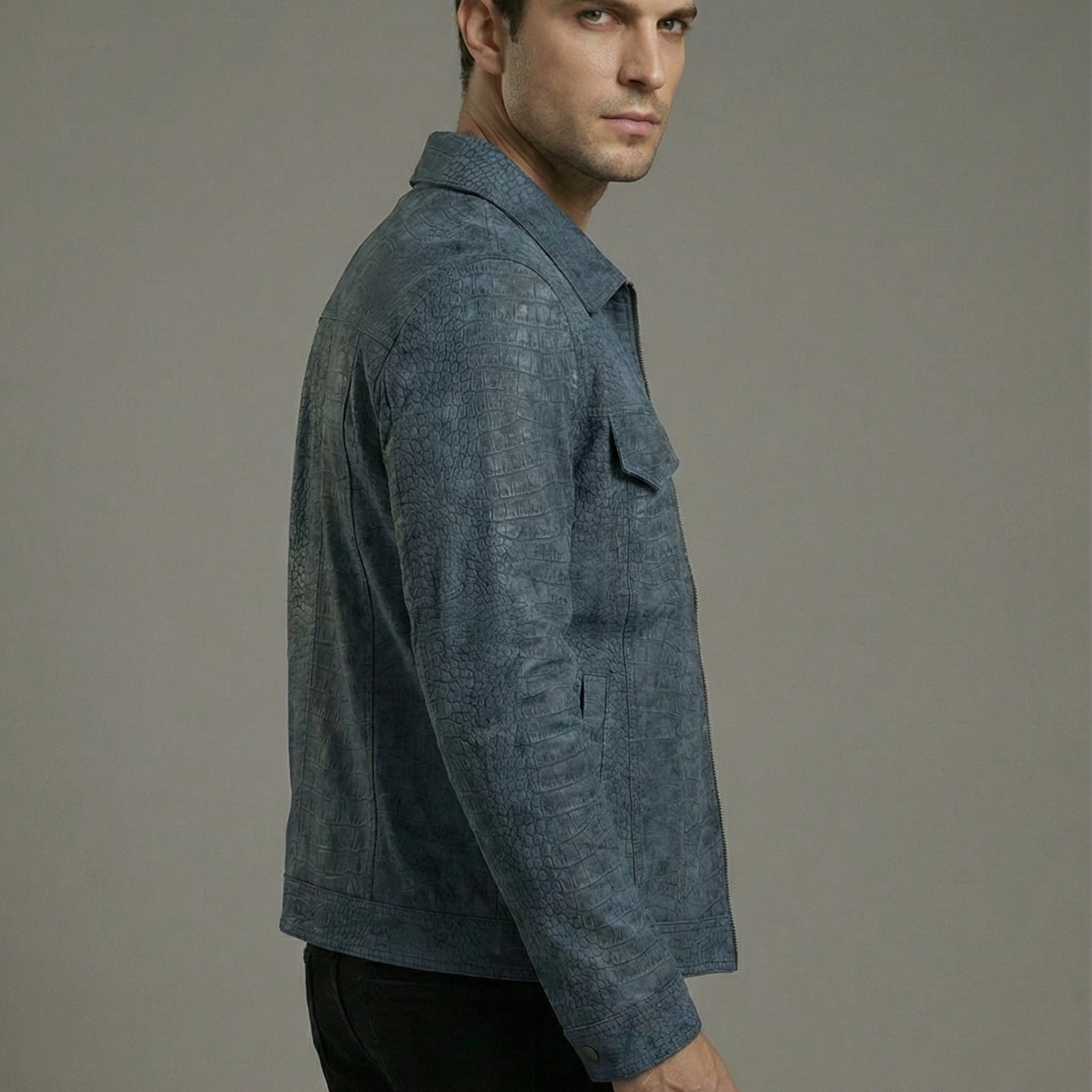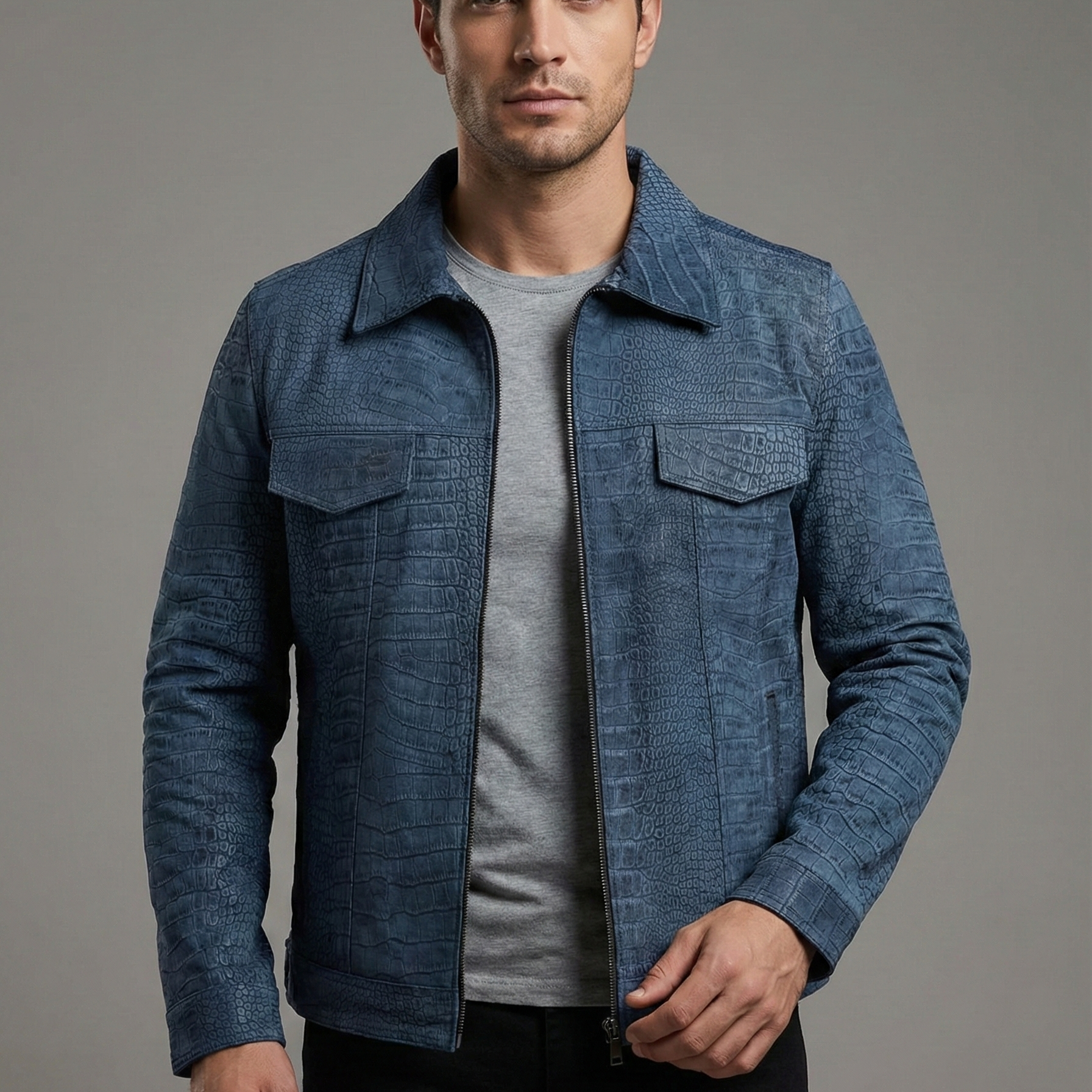 Sıradanlığı reddeden ve stilinde egzotik bir lüks arayan erkekler için Towns Kroko Baskı Deri Mont eşsiz bir seçenektir. Mavinin en sofistike tonuyla tasarlanan bu özel model, yüzeyindeki belirgin kroko (timsah) desen baskısıyla güçlü ve karakteristik bir duruş sergiler. Gömlek yaka detayı ve göğüs cepleriyle klasik bir form sunarken, dokusundaki vahşi estetikle fark yaratır.