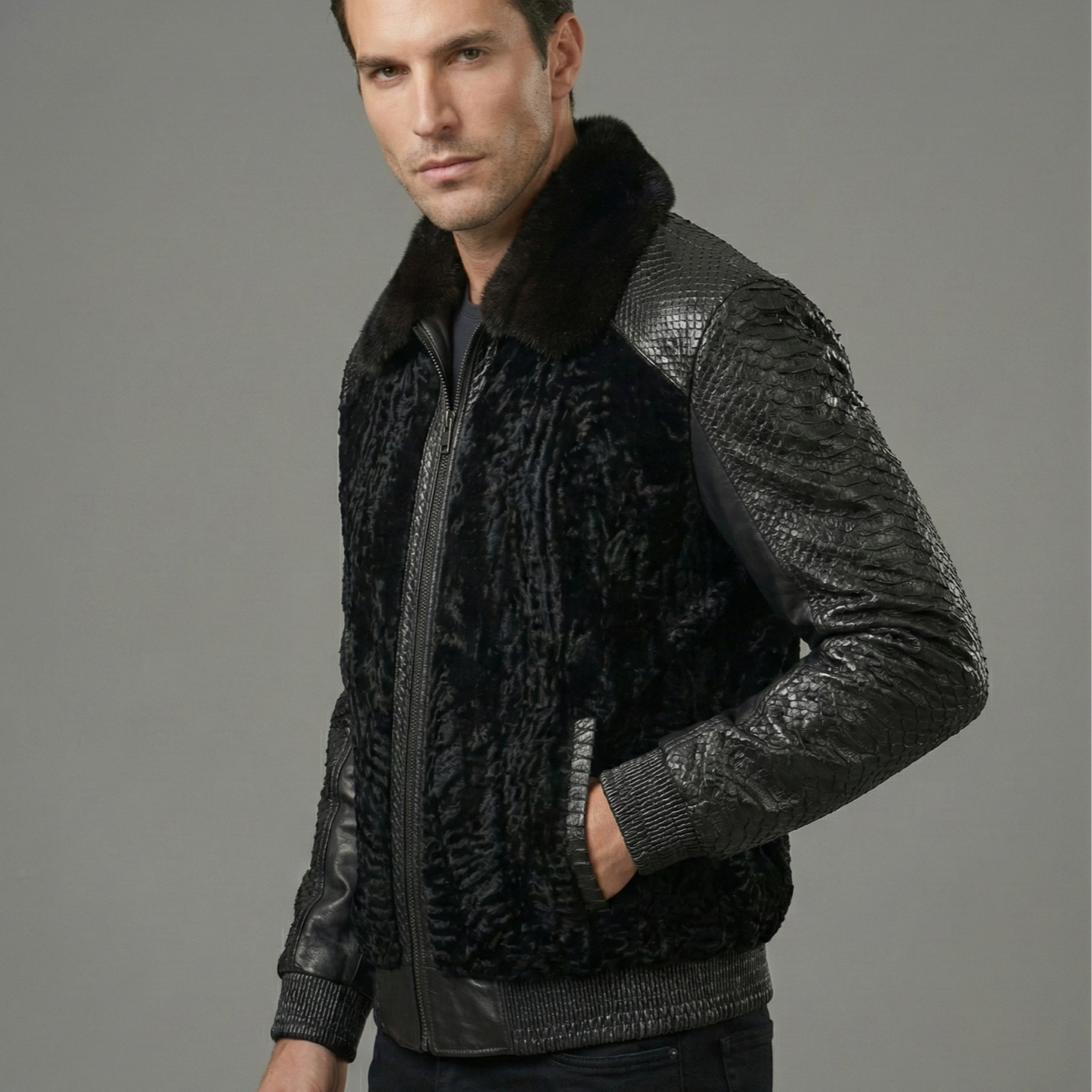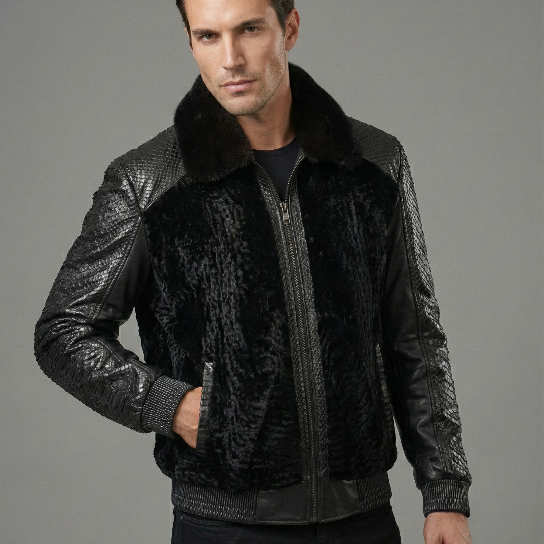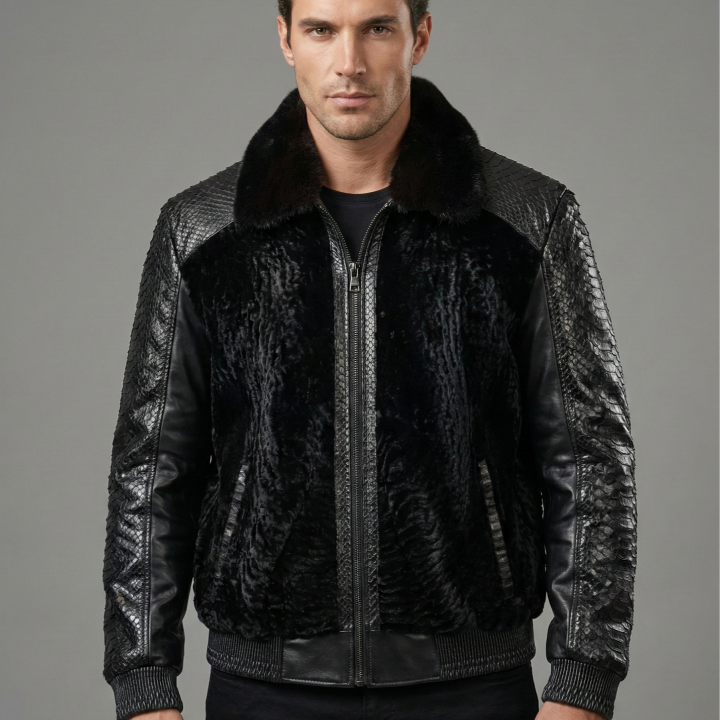 Piton Derisi Kollar: Kolların tamamında kullanılan %100 gerçek piton derisi, karakteristik pullu dokusuyla VIPER Erkek Deri Mont modeline egzotik ve güçlü bir hava katar.